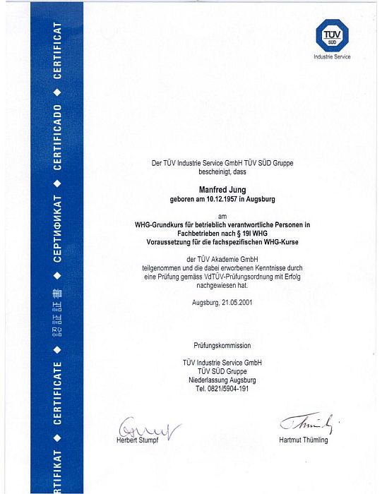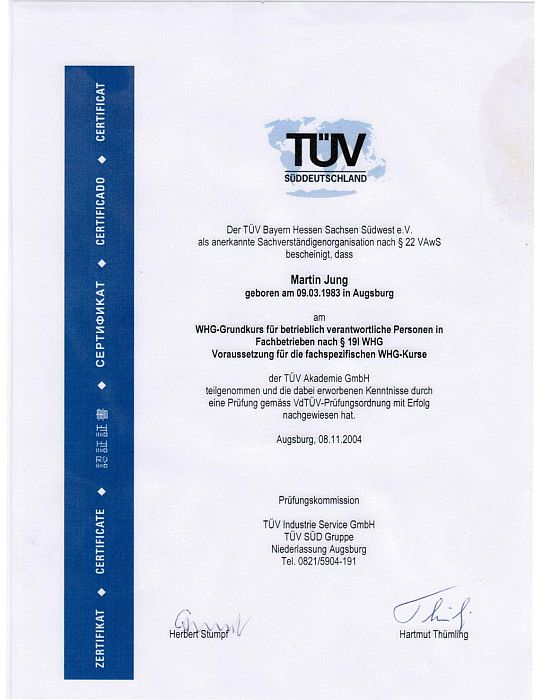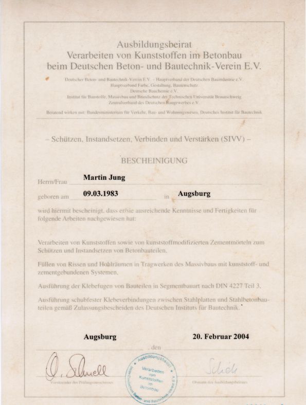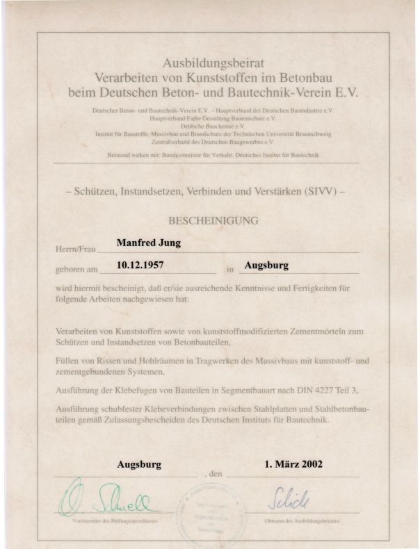 Wir haben die TÜV-Zulassung für Beschichtungen nach WHG und den SIVV-Schein für Betonschutz und -sanierung.