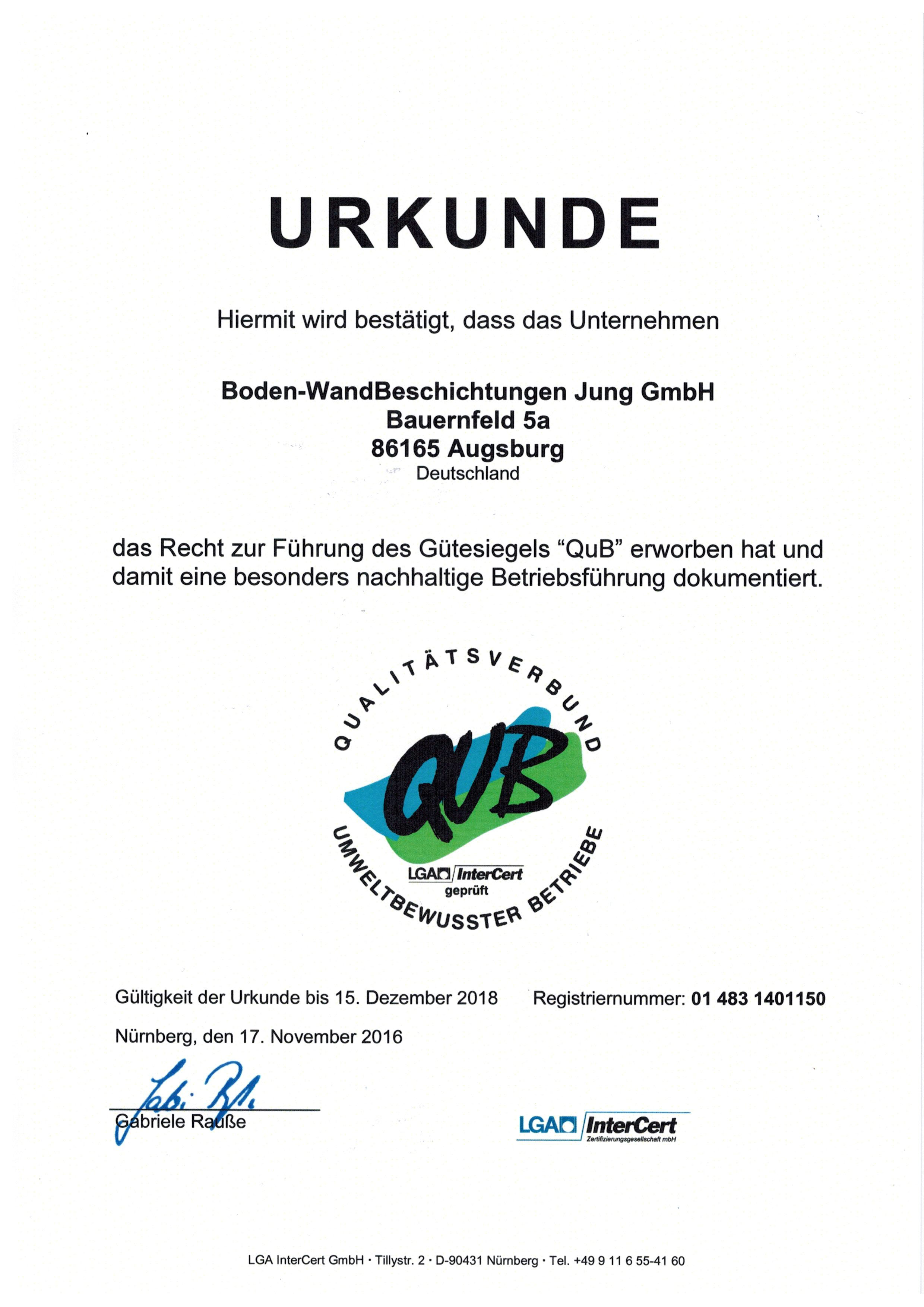 Außerdem haben wir ein auf die Bedürfnisse kleiner und mittelständischer Betriebe abgestimmtes, staatlich anerkanntes Managementsystem nach den Richtlinien des Qualitätsverbunds umweltbewusster Betriebe (QuB) aufgebaut und einige Male von der unabhängigen Organisation LGA-Intercert GmbH prüfen lassen.